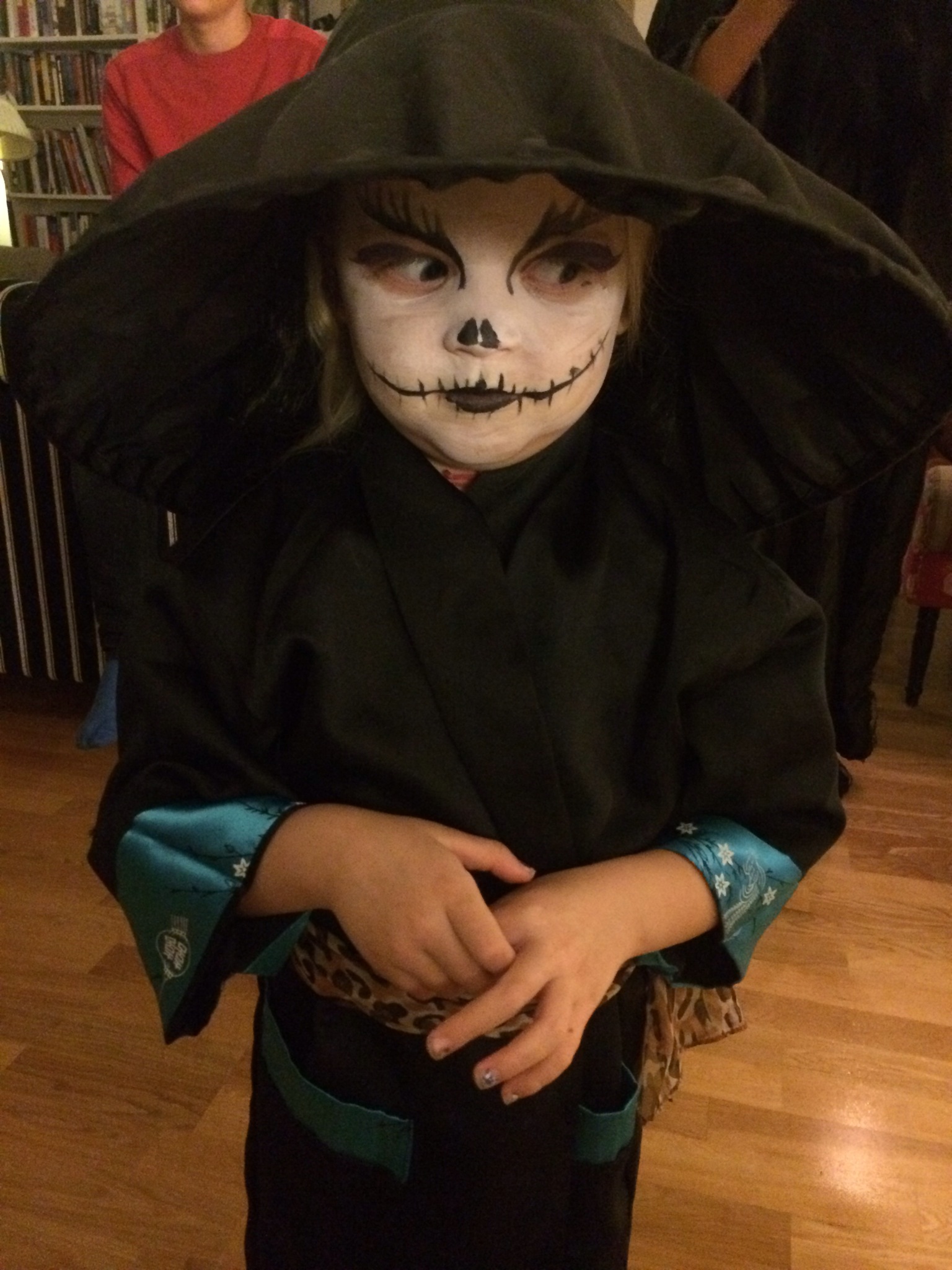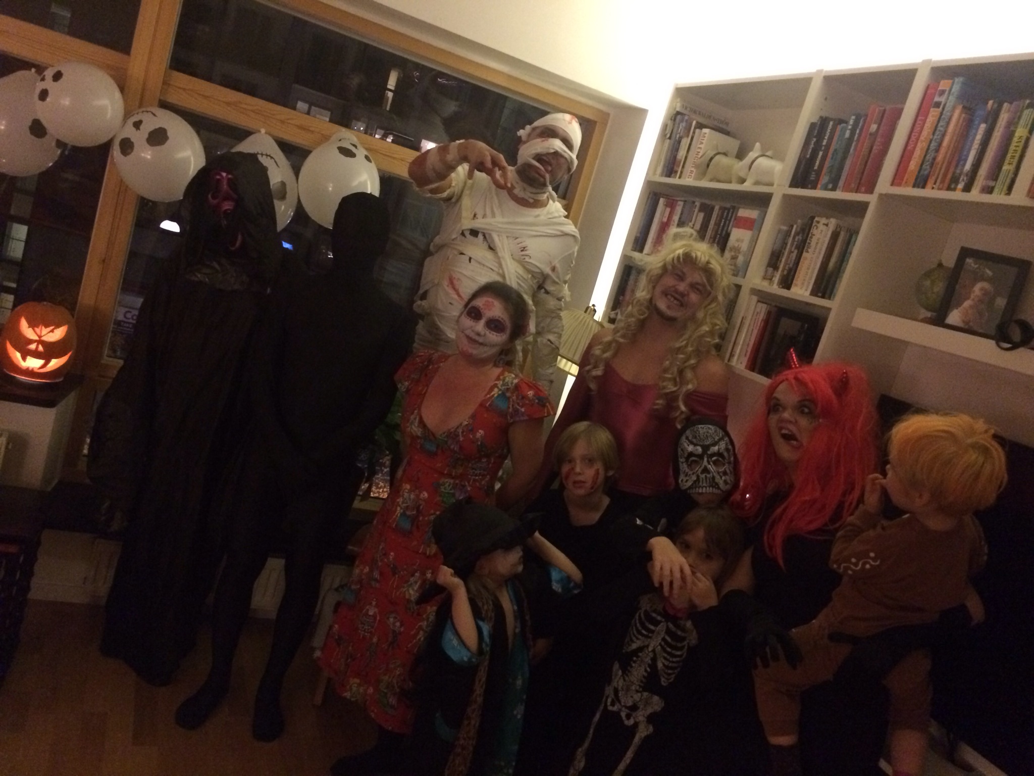 Igår firade vi Halloween och gick lite all in, kan man säga. Det känns idag. Det som nog känns allra mest är konsekvenserna av att någon tyckte att det var en lysande idé att inleda en vinprovning med våra bröllopspresent-viner klockan fem på morgonen och att ett annat ljushuvud tyckte att det verkade festligt att thaiboxas med en full zombie. Eftersom sistnämnda ljushuvud har väldigt lätt för att leva sig in i situationer som inbegriper just zombies blev zombien ifråga tvungen att försvara sig. Kan knappt gå idag av nämnda orsaker, men det var klart värt det. En annan lysande idé var den att vi vuxna skulle gå runt och göra en vuxen-variant på bus eller godis. Det vill säga att ringa på hos grannarna och bara se helt uttråkade ut och sträcka fram handen och säga: ”Bus eller pengar?” Kanske att Pelle i sin rosa balettdräkt hade målat lite fula teckningar som han räckte fram med en trulig uppsyn. Om de inte hade några kontanter tänkte vi erbjuda möjligheten att swisha över pengar. Lyckligtvis hann vi aldrig med det.
