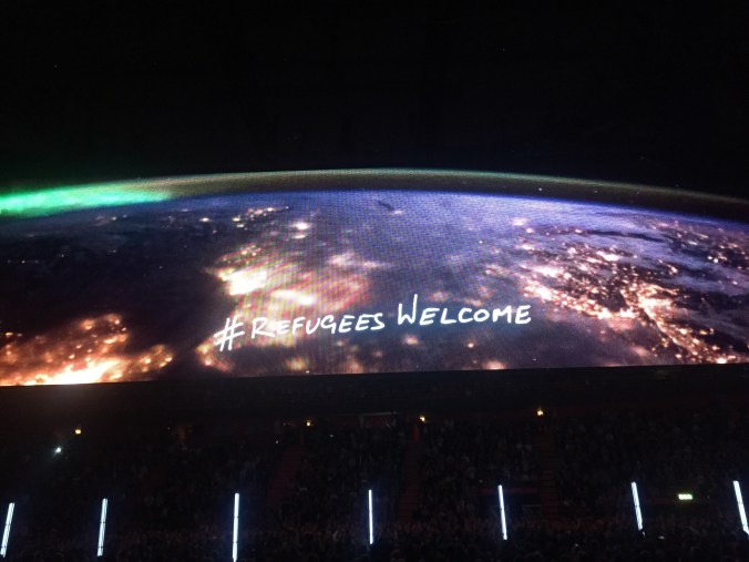 Det kändes, trots allt, så hoppfullt, fint och mäktigt. Särskilt efter Bonos brandtal som inleddes med Nordirlands blodiga historia och utmynnade i dagens kritiska läge. Och när hashtaggen: #welcomerefugees dök upp på storbildsskärmen och arenataket nästan lyfte av folkets dånande jubel såg vi att L stod upp igen. Med händerna i luften.