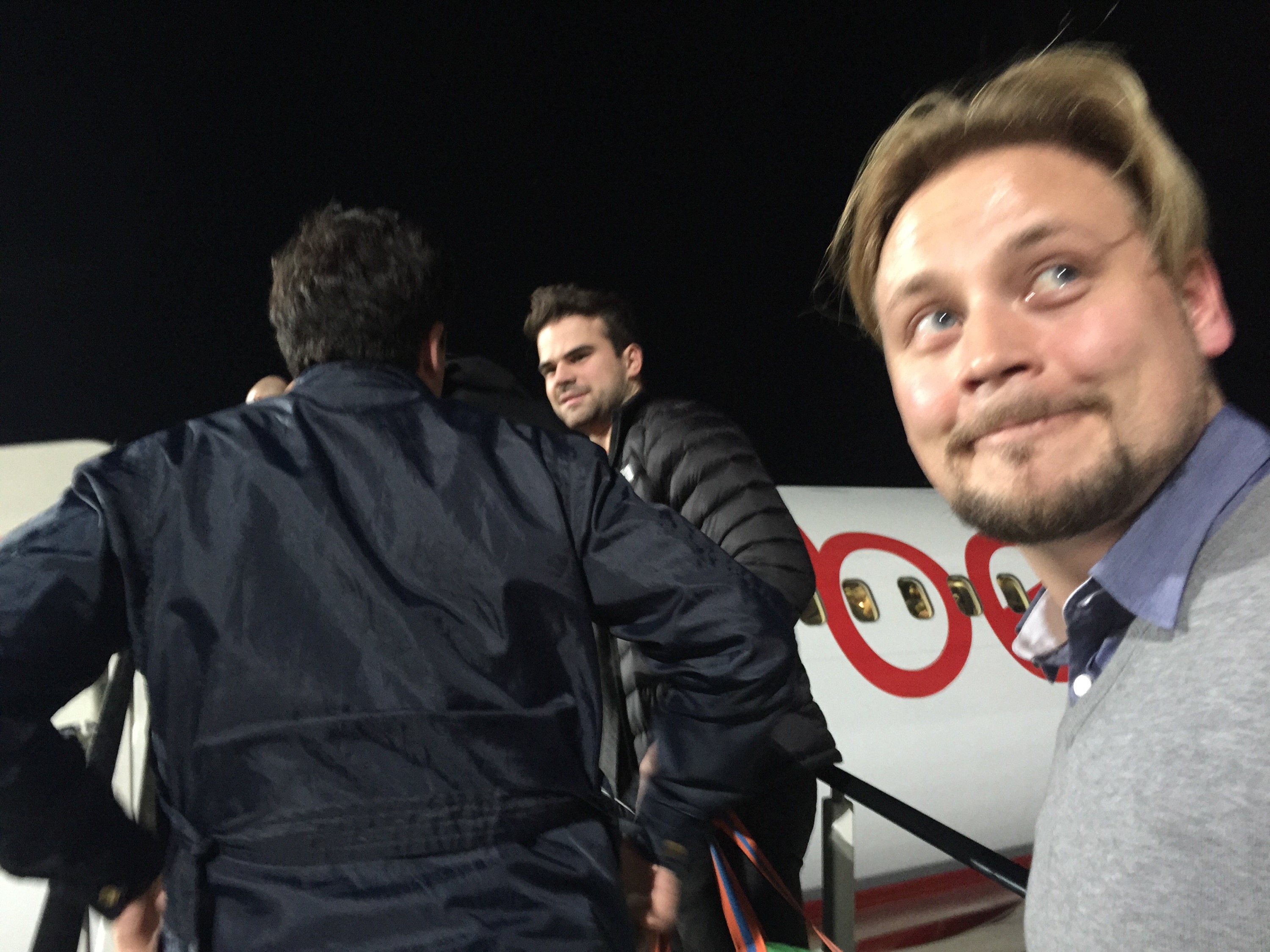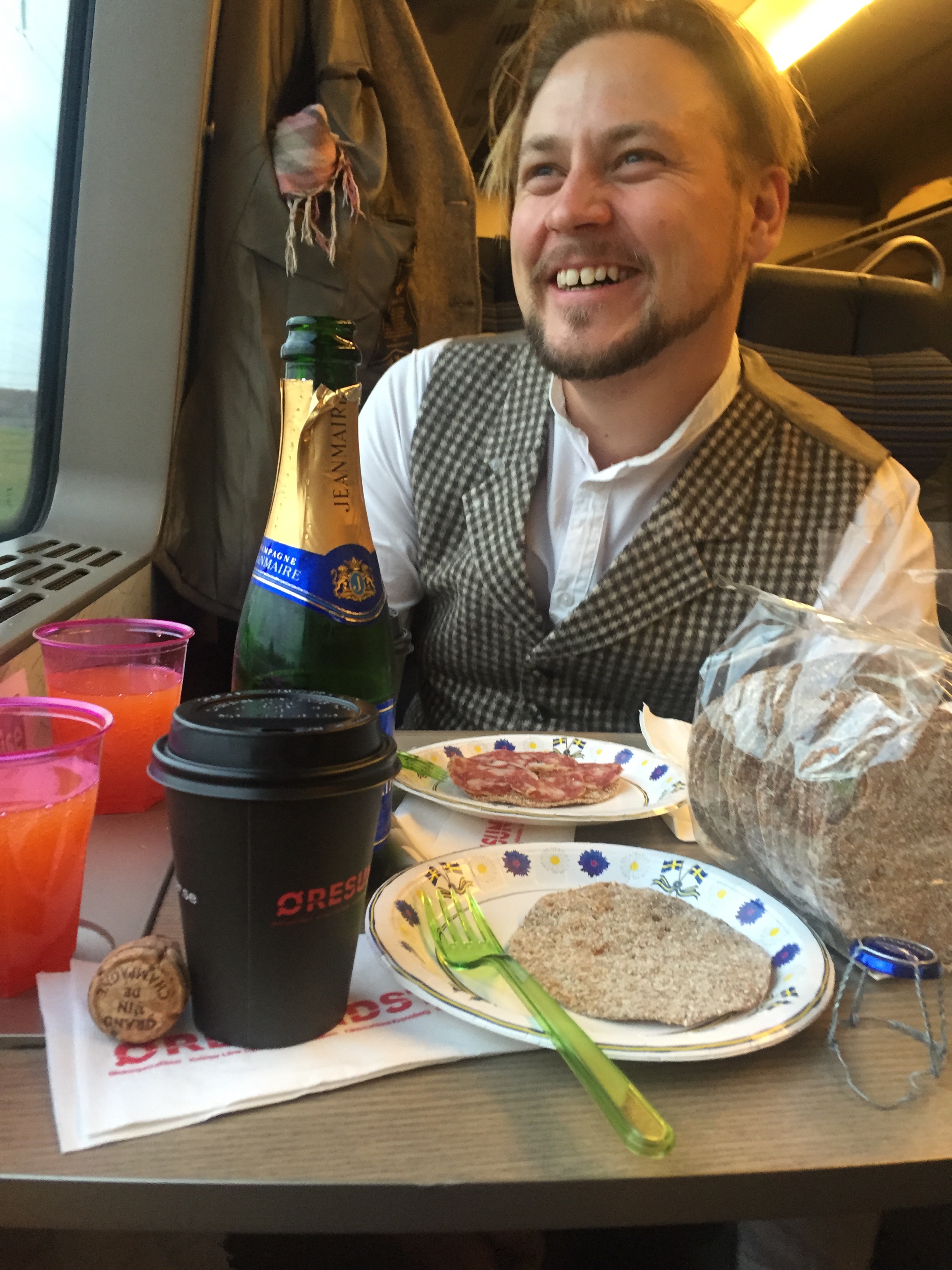 Strax därpå bjöd världens bästa man på medhavd finfrukost. Planen var: tryffel-salami (eftersom jag är vegetarian var ju just det helt ointressant, men i alla fall), tre vällagrade ostar, lyx-knäcke och mimosa. Det sistnämnda gick dock i stöpet eftersom Pelle hade råkat köpa morots-juice. Men det lilla i-landsproblemet drog inte ned stämningen det minsta, man är ju sällan vare sig särskilt nogräknad eller kinkig klockan 7.00 på morgonen när man är ute på äventyr. (Till skillnad från alla pendlare som hatade de två finklädda töntarna som fyllande till, snackade hittepå-danska och förpestade luften med illaluktande ostar i två timmar.) Det hade heller såklart ingenting som helst med flygrädsla att göra att vi delade på två flaskor champagne vid denna arla timma.