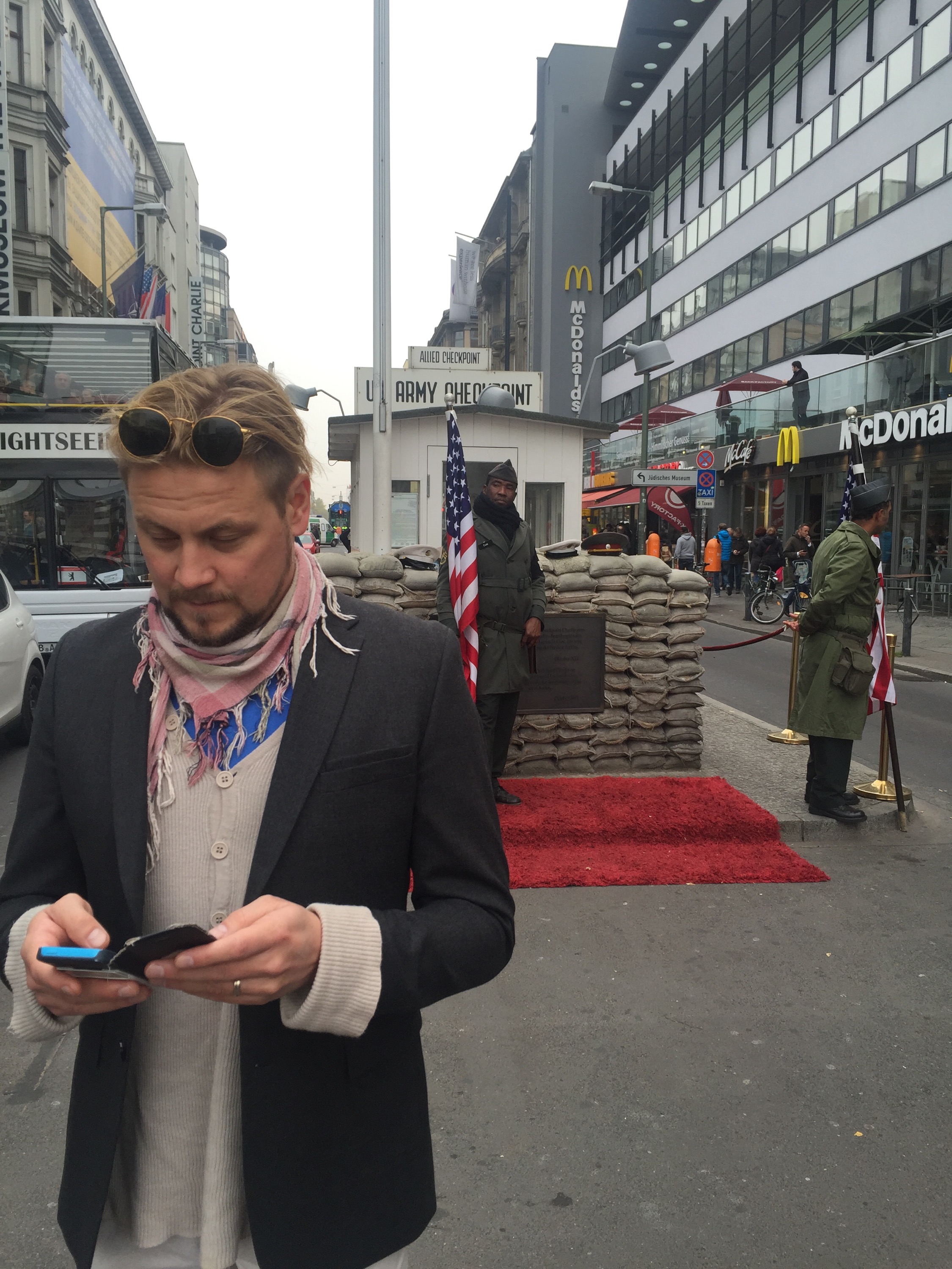På bilden nedan är Pelle upprörd över de kommersiella krafterna som tagit över Checkpoint Charlie. Ingen kunde gå fram utan att få en töntig militärkeps påtryckt på huvudet och bli avkrävd €20 för en bild. Pelle blev så himla arg över att de hade lagt ut en röd matta från IKEA och att de hade amerikanska uniformer från olika tidsåldrar på sig att han var tvungen att gå in på Facebook.