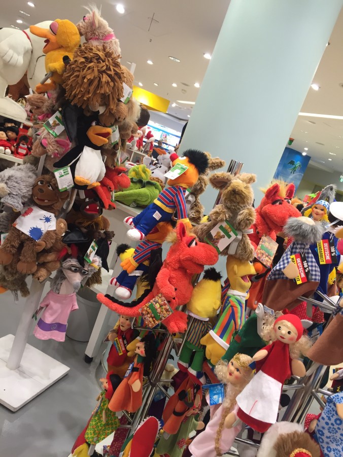 Varje dag återvände jag till min favoritplats,: dockavdelningen på KaDeWe. Här tillbringade jag nog mest tid under hela vårt Berlinbesök. Varje gång vi gick in på KaDeWe, som är den tyska motsvarigheten till Harrod´s, föreslog jag fria aktiviteter för Pelle. Han förstod nog, men låtsades tycka att det var en god idé (och gick iväg och provade lite sniglar och absinth eller nåt, vad vet jag?) medan jag lekte med alla dockor, testade olika röster och karaktärer och skrämde ett och annat barn. Jag köpte med mig tre stycken hem; en Henry, en Mika och ett kakmonster. Är fortfarande bitter över att jag inte köpte den gröna draken. En gång blev jag väl exalterad och råkade kasta mig ner i en kartong när två personer ur personalen stod och inventerade. Eftersom jag har både selektiv hörsel och selektiv språkförståelse förstod jag inte när de sa att jag inte fick röra de där dockorna. Men det gjorde Pelle (som smög på mig). Han skämdes eventuellt lite extra mycket när jag försökte avleda dem genom att jaga ett litet förskrämt barn runt i affären med supersöt fladdermus-docka. #otacksam