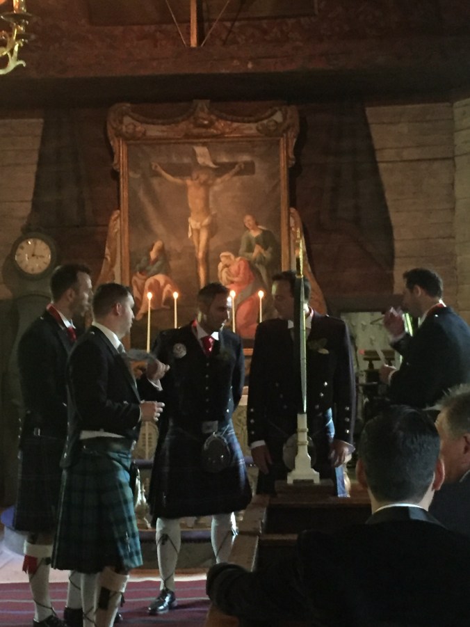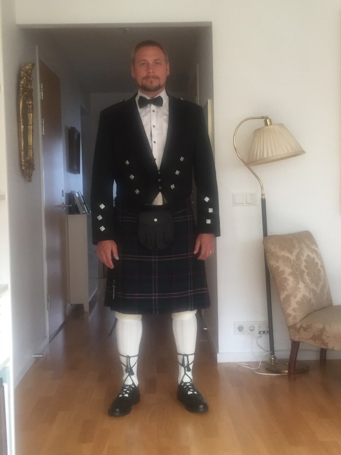 Apropå outfits så hade Pelle hade fått den stora äran att bära brudgummens tartan, det vill säga Johns klans eget kiltmönster. Någonting som Pelle tog på allra största allvar. Han har ända sedan han förärades kilten jagat Prins Charlie´s jackets, köpt strumpor med tillhörande strump-flaggor (jo, det är sant: man ska ha flaggor i strumporna), kilt-pin, skjorta, dolk (något som senare skulle visa sig vara förödande) och kollat på youtube-klipp hur man arrangerar sin klädsel på ett korrekt vis. Underklädes-posten var det enda som inte belastade klädbudgeten eftersom Pelle fått tydliga instruktioner att ”go commando” av Johns best man Gunny, det vill säga det där enda som vi alla är riktigt säkra på ingår i den skotska högtidsdräkten: free-balling.