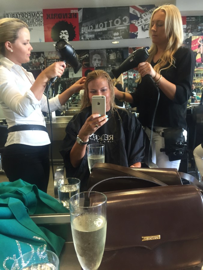 Väl hos frisören fick jag ett formidabelt mottagande. Eftersom jag hade råkat åka till fel adress först blev det ganska bråttom, men det var inga konstigheter; två frisörer tog sig an häxhåret och en tredje satte ett glas bubbel i handen på mig. Det enda lilla smolket i bägaren kan ha varit när frisören frågade vad jag skulle ha på mig på bröllopet. ”Eh, ja. Det här då. Som jag har på mig nu alltså. Och det.” Funderade ett ögonblick om hon kanske trodde att jag tänkte ha på mig frisör-ponchon, men vad vet jag. Självförtroendet levlade i alla fall inte direkt upp. Men jag är ändå på level 16 i Pokemon Go så det gjorde ingenting.