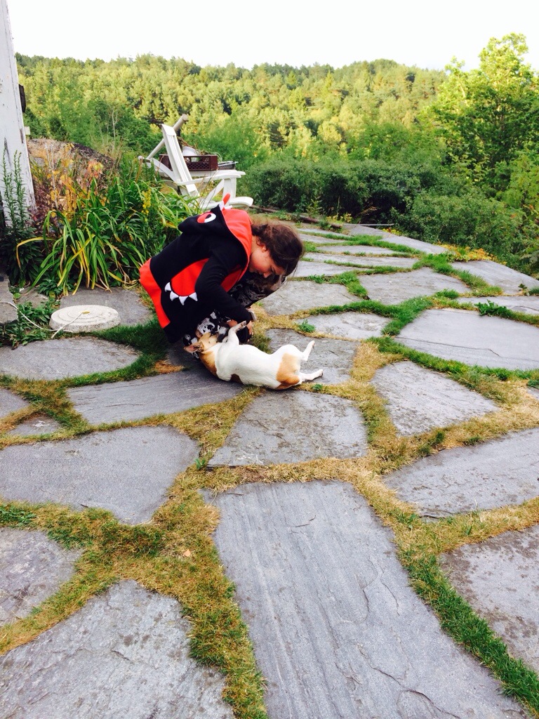 ”Inca håller i en frågesport för oss alla på altanen. Nusse och Lollo är också här. Inca frågar: vad är lätt att få men svårt att bli av med?